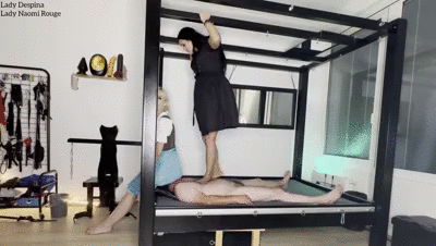 Zwei Herrinnen und ein nackter Loser da bietet sich ein geiles Trampling an. Die Herrinnen belassen es aber nicht bei den Tritten, sie verpassen dem Loser auch ein Facesitting und necken ihn mit einem Handjob. Da sie die Kontrolle und somit auch die Orgasmuskontrolle haben, darf er nicht abspritzen. Zur Kontrolle gehört auch die Atemkontrolle. Die beiden Herrinnen verpassen dem Loser ein Smothering und gleichzeitig eine Nippelfolter. Für die beiden Herrinnen ist der Sklave eine willenlose Marionette mit der sie spielen können.