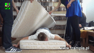 Wenn Frauen Langeweile haben, kommen sie auf die verrücktesten Ideen. Ein devoter Mann hat es dann schwer, sich noch behaupten zu können. Hier sorgt gleich eine ganze Frauengruppe dafür, das ihr Opfer unter Matratzen begraben wird. Die jungen Ladys nutzen die Gunst der Stunde und klemmen den Sklaven zwischen die Matratzen, um ihn anschließend lachend mit ihren hohen Stiefeln zu zertrampeln. So viel Gewicht auf einmal, können nur die wenigsten Männer aushalten.