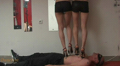 Heute muss der Sklave von Larissa und Loraine einiges aushalten! Die beiden Girls haben ihre geilen High Heel Sandaletten an und fangen an, auf seinem Körper herum zu trampeln! Er kann sich nicht wehren! Erst stellen sie sich nacheinander auf ihn und dann bohren sich ihre Absätze gemeinsam in seinen Oberkörper! Die Girls gehen noch lange nicht von ihm herunter, denn sie lieben es ihren Sklaven so zu erniedrigen!