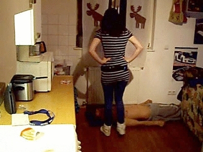 Heute trampelt die Herrin auf ihrem Pfleger herum! Sie trägt nur ihre Nachtwäsche und er liegt vor ihr auf dem Boden! Nun wird er von ihr bestraft und sie läuft in barfuss auf ihm herum! Auf seinem dicken Bauch muss sie ganz schön das Gleichgewicht halten, damit sie nicht herunterfällt! Dann muss er auch noch an ihren Füssen lecken und sie erniedrigt ihn die ganze Zeit! Was für eine dominante Herrin!